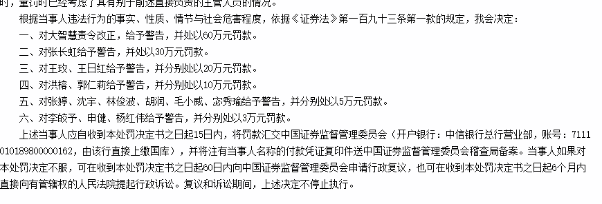 证监会还对包括时任董事长兼总经理张长虹在内的14名责任人员给予警告,并处以3万元至30万元不等的罚款,张长虹等5名责任人员被采取5年证券市场禁入措施。同时,在被证监会调查期间,大智慧谋求并购湘财证券的转型计划亦被终止。