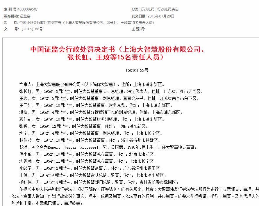 而这一次是因为三年前曾经被证监会行政处罚的案件,当时大智慧被责令改正,给予警告,并处以60万元罚款。同时张长虹被给予警告,并处以30万元罚款。