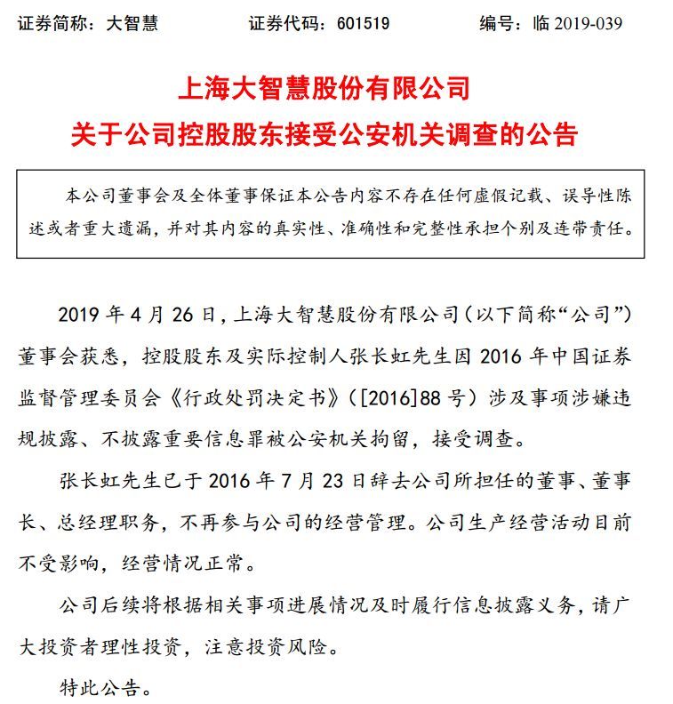 4月26日夜间,大智慧发布公告称,控股股东及实控人张长虹因2016年证监会《行政处罚决定书》([2016]88号)涉及事项涉嫌违规披露、不披露重要信息罪被公安机关拘留,接受调查。