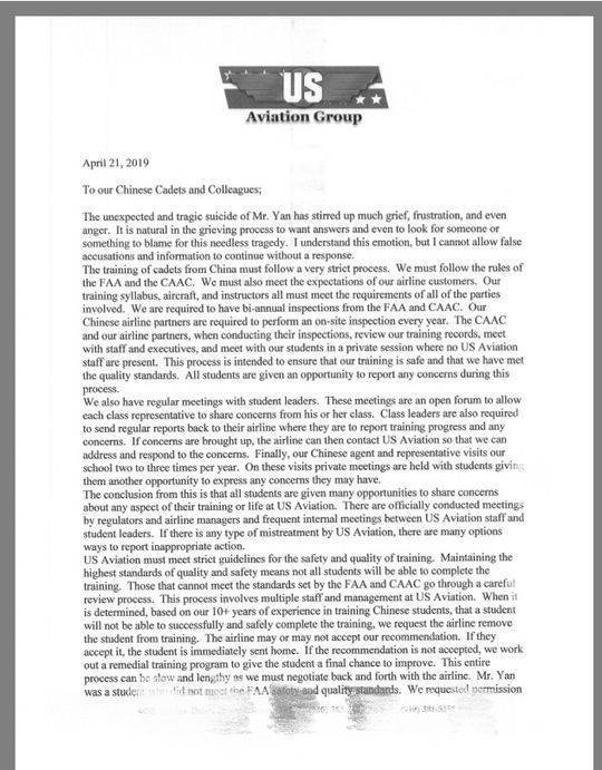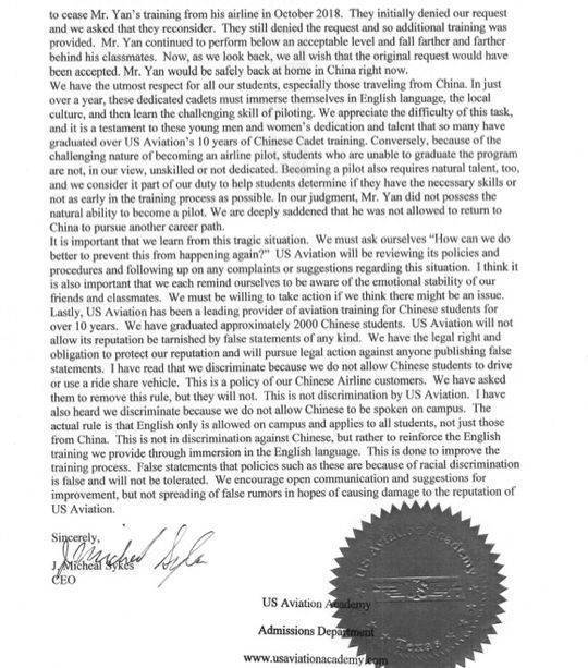 在4月21日,据在校学员称校方曾就此事在facebook公共主页上发布了一封公开信,表示小洋同学是一名不符合FAA安全和质量标准的学生,并说明之前曾向航司请求让他停止接受培训但被拒绝。之后学校又安排了额外的培训但该学员的表现仍低于标准。