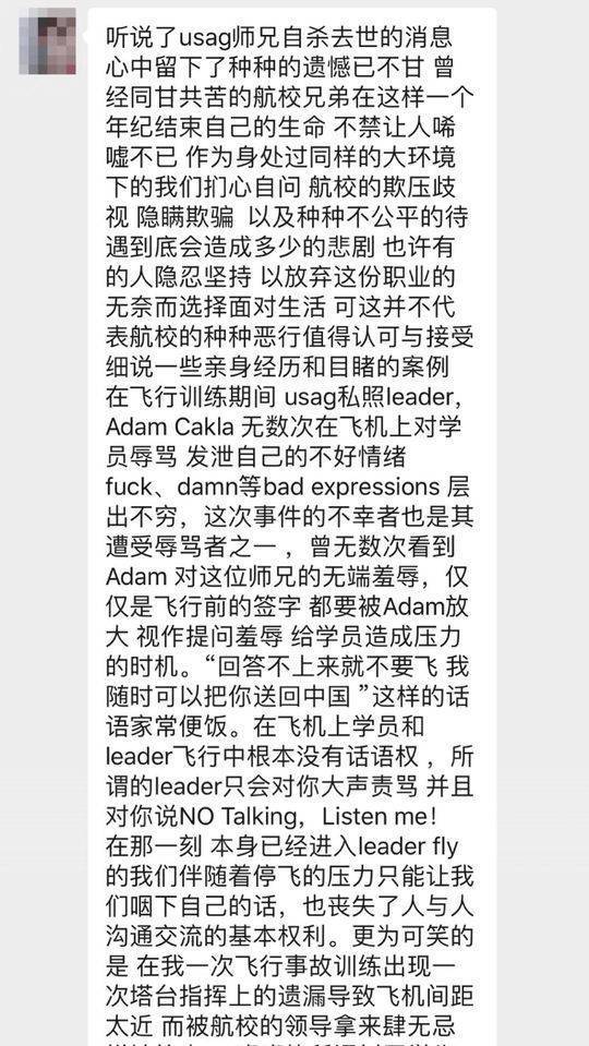 "在飞行训练期间USAG私照leader Adam Cakla无数次在飞机上对学员辱骂,发泄自己不好的情绪……这次事件的不幸者也是遭受过其辱骂的人之一。曾看到Adam对这位师兄的无端羞辱,仅仅是飞行前的签字,都要被Adam放大羞辱。"这是一位学员的留言。