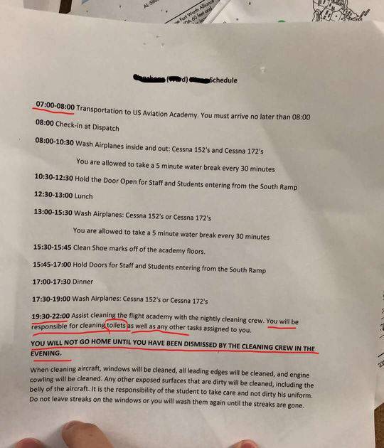 此外,相关人士透露,除了正常的飞行训练,平日学校还要安排学生擦飞机扫厕所,甚至在学生不知情的情况下让其签下停飞报告。在一名学员提供的学校日程表中,该学员于19:30-22:00之间被要求在学校清洁工的安排下从事打扫厕所一类的清洁工作,而且规定在没有清洁工允许解散离开的情况下,学员不能够回家。