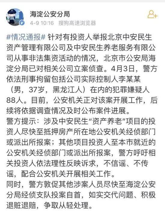 " 2月底有一笔理财到期后,他们也没有返还本金,这时候就感觉出事了。"刘婷的预感很快被证明是准确的。4月9日,北京市公安局海淀分局官方微博通报称,针对有投资人举报北京中安民生资产管理有限公司及中安民生养老服务有限公司从事非法集资活动的情况,北京市公安局海淀分局已对相关公司立案侦查。