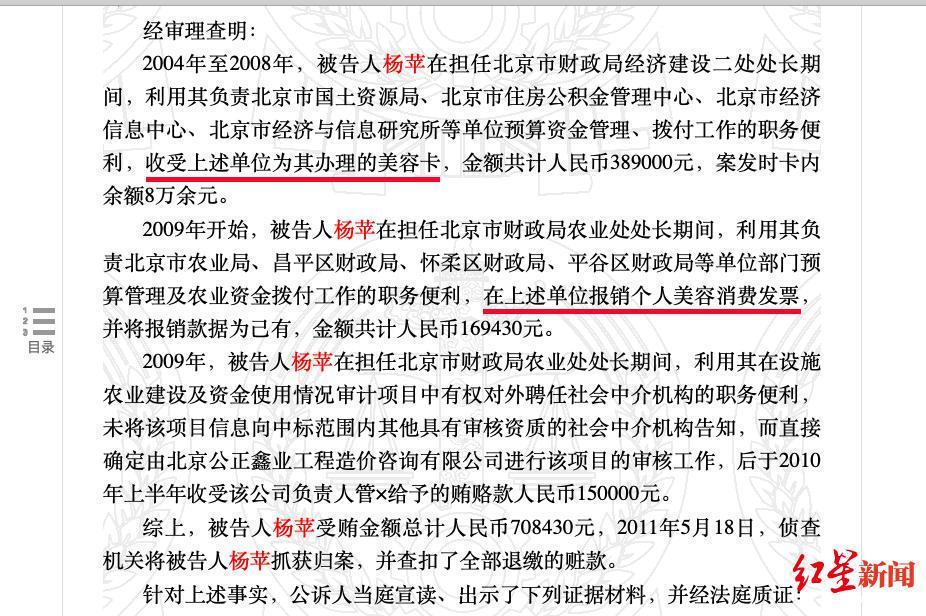 红星新闻记者检索到,中国裁判文书网公布了杨苹受贿案的刑事判决。法院审理查明,杨苹受贿总额为70.8万余元。其中大部分是"美容腐败"的涉案款物。
