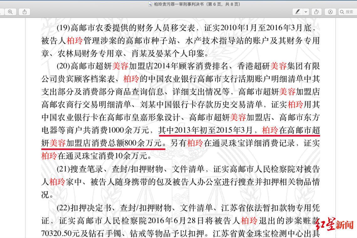 高邮市一家美容加盟店老板坦言,柏玲是其店里的大客户,消费达800多万元。负责接待柏玲的美容师说,柏先后在店里做过多项价格昂贵的美容项目。