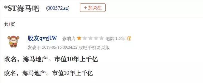 在股吧里,网友调侃说:改名,海马地产。市值10年上千亿。
