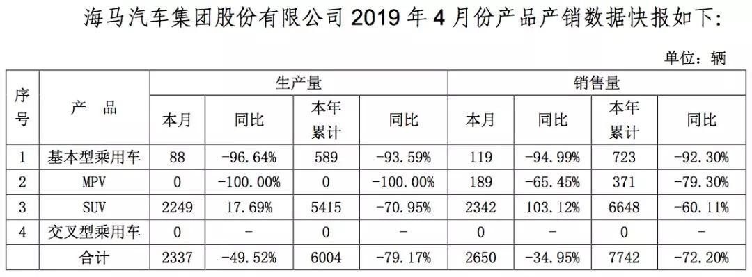 2019年,这一颓势仍在持续。5月6日晚间,*ST海马披露的今年4月份产品产销数据快报显示:汽车生产量2337辆,同比减少49.52%;汽车销售量2650辆,同比减少34.95%。