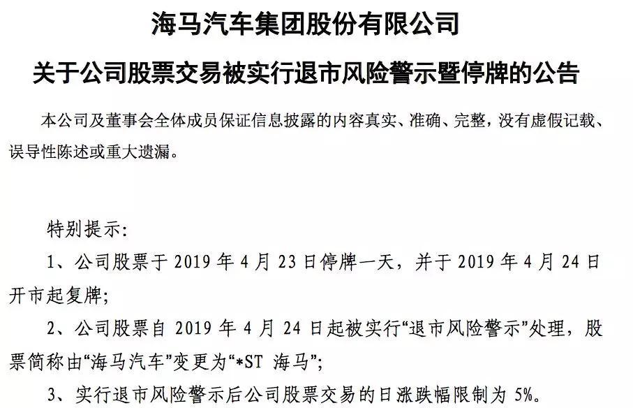 在4月22日晚间第一次宣布卖房的同时,*ST海马发布了2018年年报。由于公司2017年度、2018年度连续两个会计年度经审计的净利润为负值,深交所将对公司股票交易实行“退市风险警示”。海马汽车“披星戴帽”,股票简称变更为“*ST海马”。