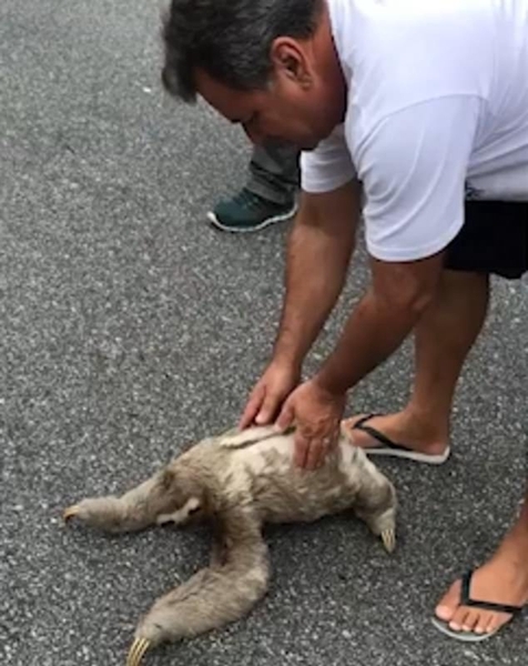 视频中,一只树懒在出行高峰期试图通过一条马路,但由于车流拥挤,它的行动十分困难,只能伸长四肢在路中央缓慢爬行。这时,一位名叫何塞(Jose Aldenizio)的中年男子决定对它出手相助。何塞将过路的车拦停并将树懒抱起来,快速地带它穿过道路,然后将它放在路旁的树上。