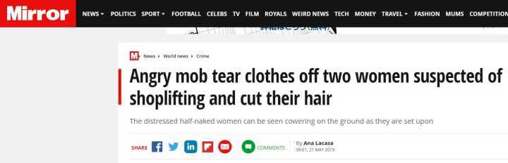 英国《镜报》21日报道了一起冲突:墨西哥两名女子因偷东西被抓,还被愤怒的人们撕破衣服,剪掉头发。