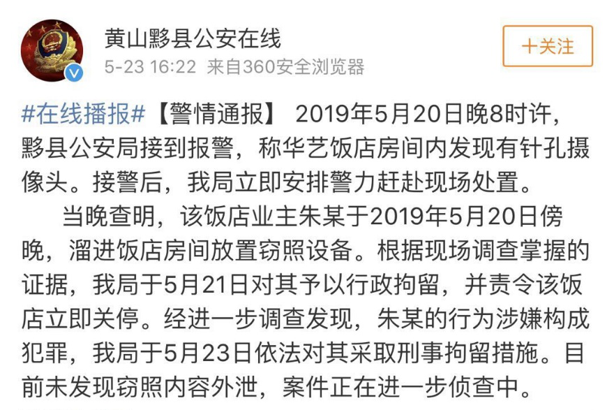 (北京时间记者 潘琦 报道)5月23日,安徽黄山市黟县公安局通报,当地一饭店房间内被报警发现有针孔摄像头,警方当晚即查明为饭店业主朱某所为。目前,饭店已被责令立即关停,朱某行为涉嫌构成犯罪,已被采取刑事拘留措施。