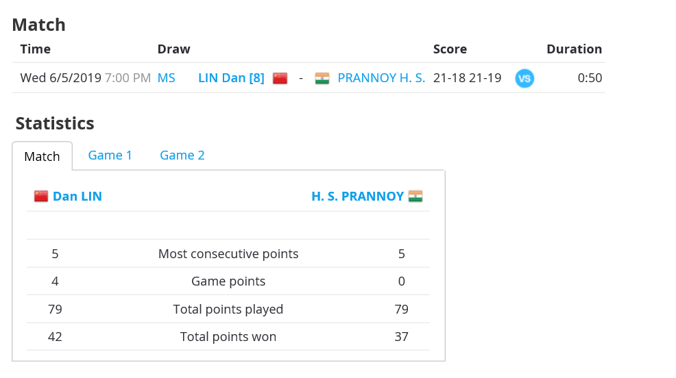 今天的对手普兰诺伊,林丹此前3次与其交手,1胜2负处于下风。此番相遇,林丹以21比18先下一城。第2局,双方战至19平后,林丹两次关键得分锁定胜局。第2轮,他的对手是另一名印度选手卡什亚普。