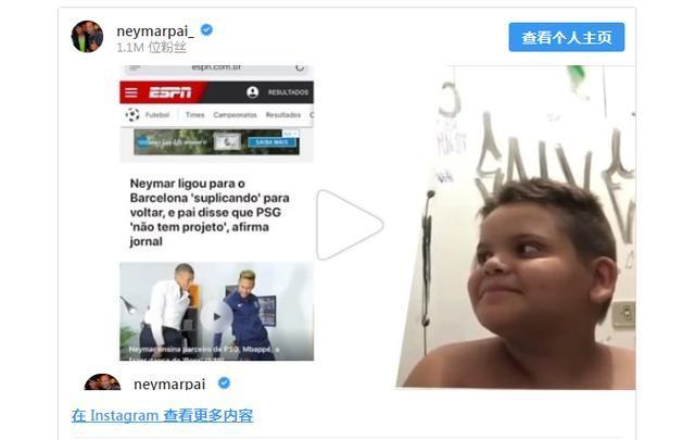 内马尔父亲之后又发布了一条消息,左边是ESPN对这一新闻的转载,右边是一个带着笑容的小孩的画面,显然是讽刺这一新闻可笑,他还写道:“虚假新闻,疯狂新闻。”