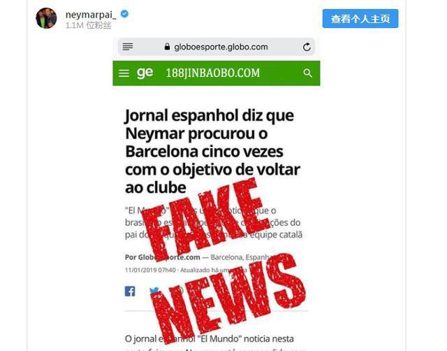 内马尔父亲将巴西“环球体育”转载的《188体育世界报》的文章截屏,并打上了“假新闻”的字样,发布在社交网站个人账户上。