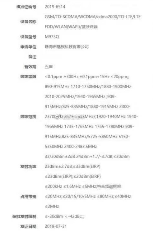 8月2日消息 近日有微博网友爆料称,一款型号为M973Q的魅族新机目前已获国家无线电发射型号核准,发证日期为7月31日。有意思的是魅族16s的设备型号为M971Q,那么近期通过无线电核准的M973Q则很有可能就是传闻中的魅族16s Pro。