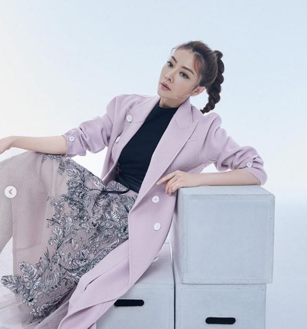 熊黛林一袭长裙搭配紫色大衣优雅又气质,随意一个pose都充满高级感。