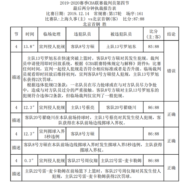 北京时间12月15日消息,上海男篮主场对阵北京男篮比赛裁判报告出炉,其中出现1次错判:北京队方硕在最后13.8秒时对上海队罗旭东的犯规应升级为违体犯规。