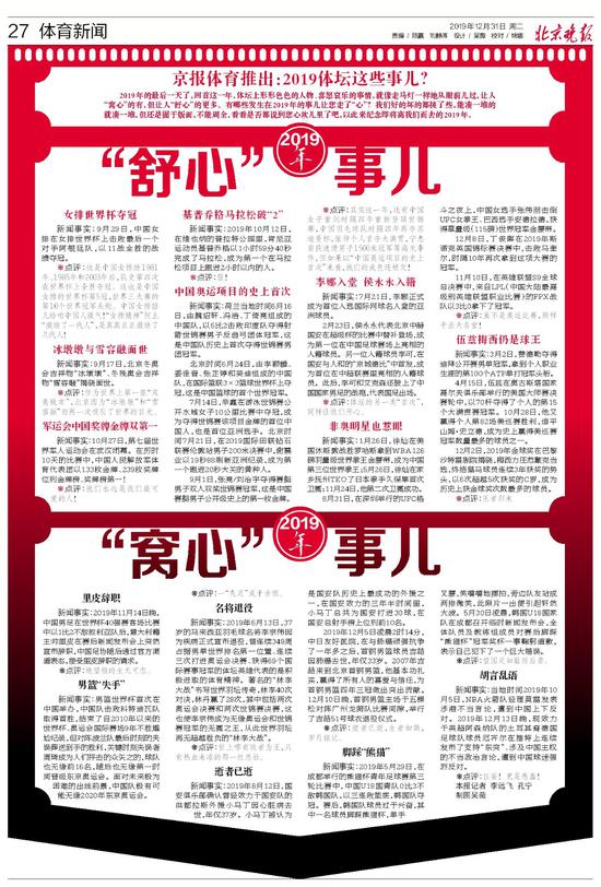 中国女排鼓舞国人 2019年的最后一天了,回首这一年,体坛上形形色色的人物、喜怒哀乐的事情,就像走马灯一样地从眼前儿过,让人“窝心”的有,但让人“舒心”的更多。有哪些发生在2019年的事儿让您走了“心”?我们好的坏的都挑了些,能凑一堆的就凑一堆,但还是囿于版面,不能周全,看看是否都说到您心坎儿里了吧,以此来纪念即将离我们而去的2019年。