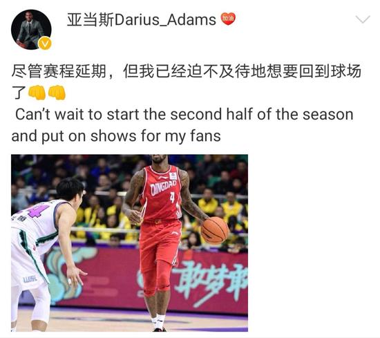 安全,期待CBA联赛早日恢复正常比赛。昨日,他在社交媒体发文表示,“尽管赛程延期,但我已经迫不及待地想要回到球场了”。目前,春节休假回到美国的亚当斯正进行个人训练,与球队保持密切的沟通联系,积极备战,时刻准备迎接后面的CBA比赛。本赛季至今,亚当斯代表青岛国信双星男篮场均出战36分钟,贡献34.9分8.1篮板5.9助攻和2.6次抢断。凭借着优异的表现,曾荣膺中国人寿第二期月度最有价值外籍球员。
