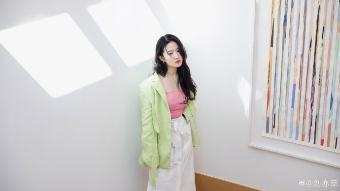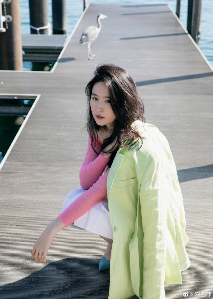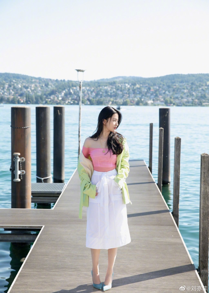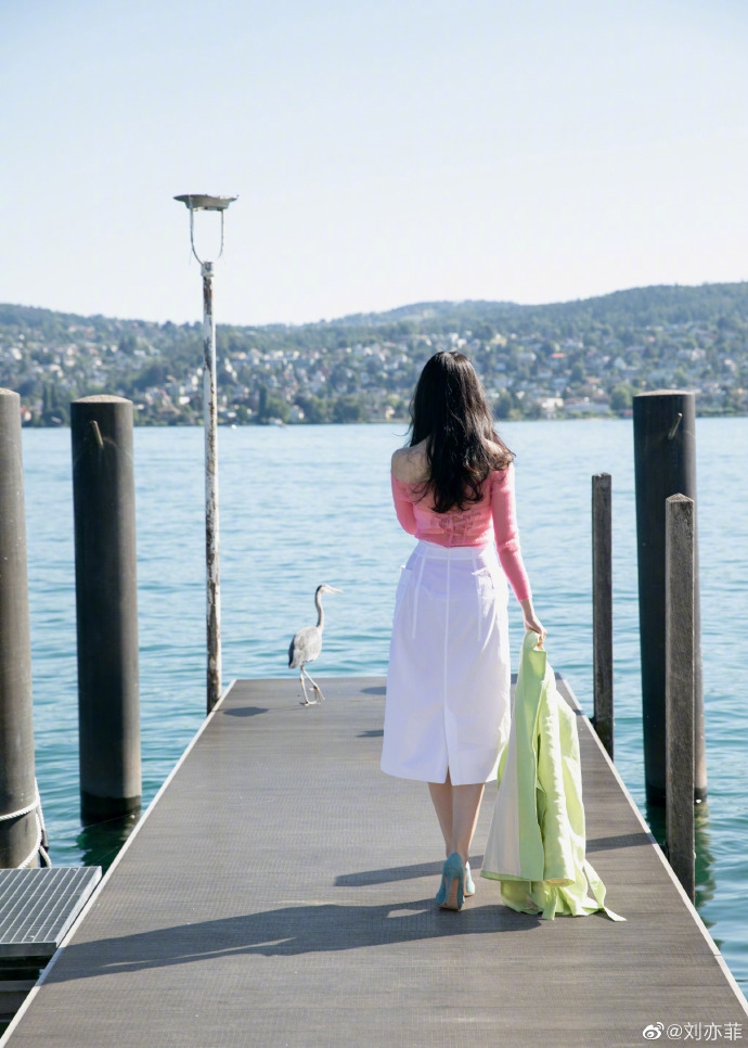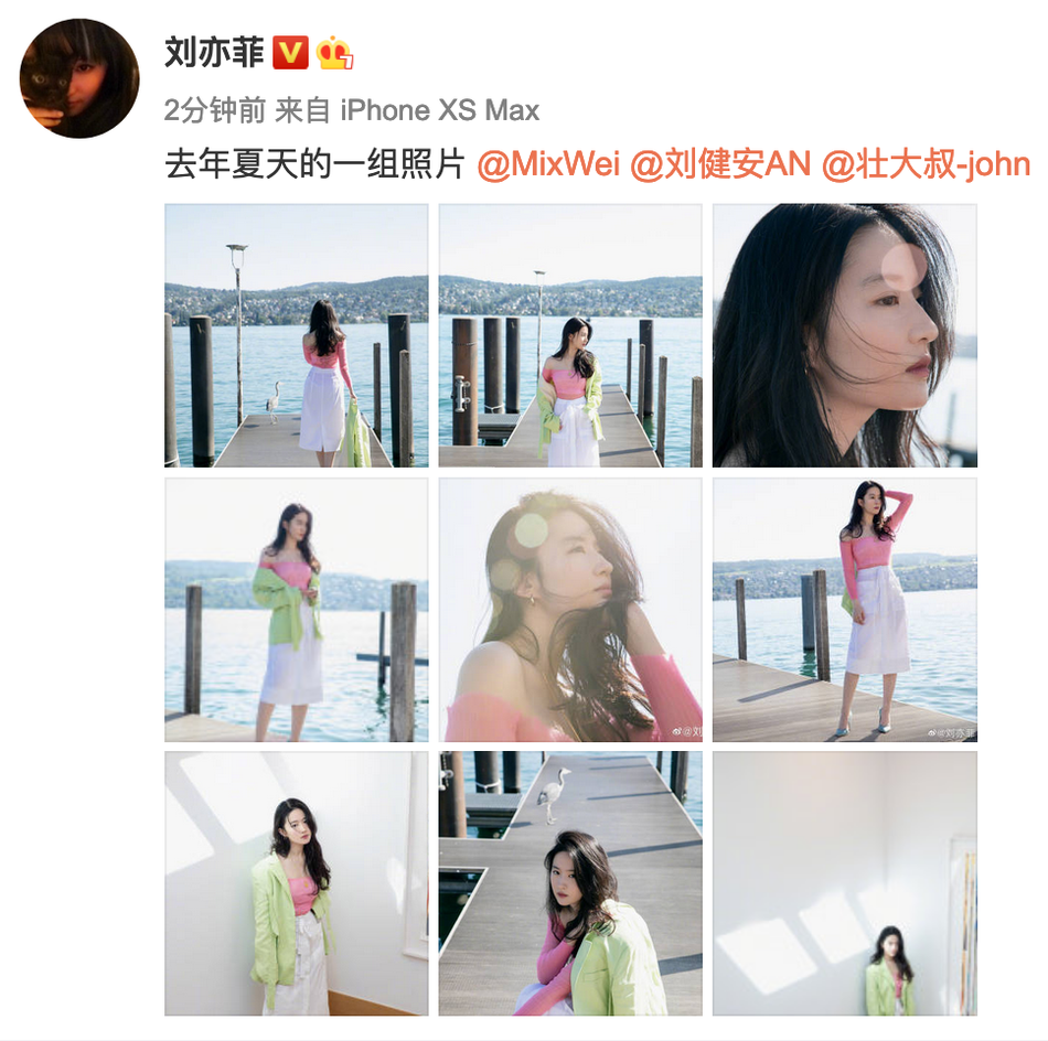 7月21日,刘亦菲在微博分享九宫格库存美照,并发文:“去年夏天的一组照片”。照片中刘亦菲身穿粉色露肩紧身长袖搭配白色长裙,外搭青绿色西装外套。她站在海边的栈桥上,发丝随微风舞动,阳光洒下来画面温柔美好。