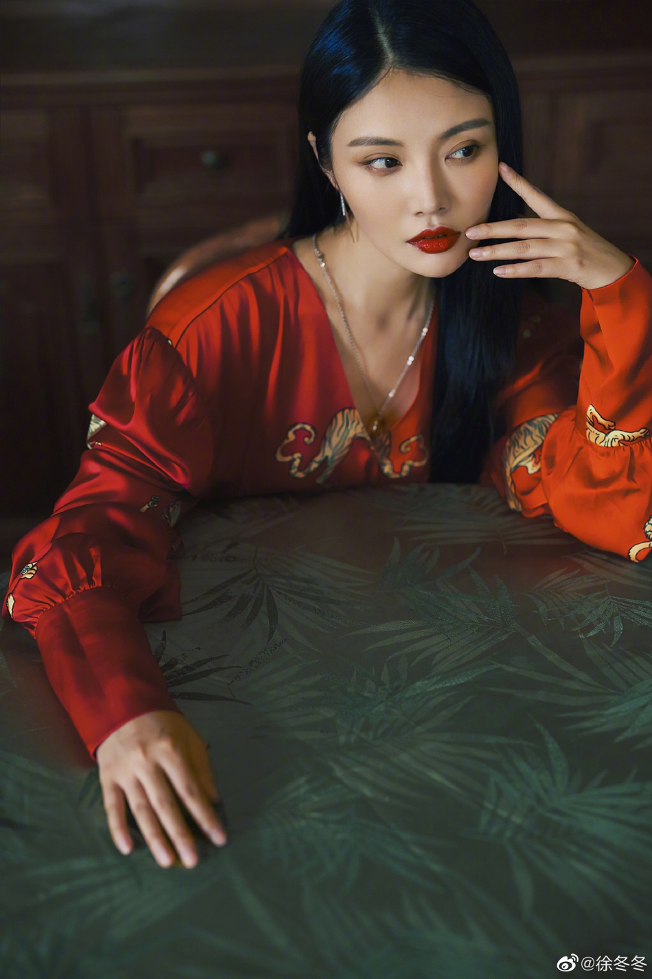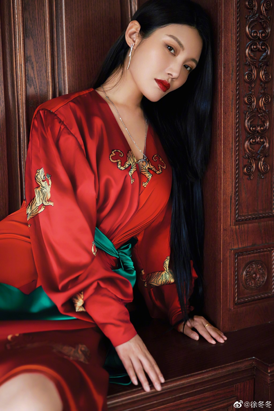 11月9日,徐冬冬在微博晒出一组美照,并配文:“我适合黑长直?还是适合弯卷黄?”照片中,她穿红色丝绸深v浴袍配绿色束腰带,黑长直发及腰性感又迷人,露白皙美腿诱惑勾人。