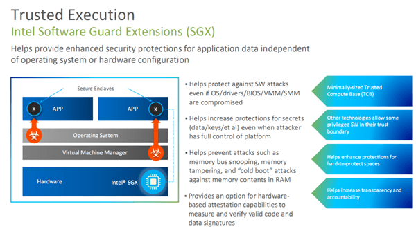 尤为值得一提的是,SGX安全技术是独立于操作系统、硬件配置的,不受软硬件变动的影响和约束,部署更方便,效果也更明显,即便是操作系统、BIOS、驱动、虚拟机都被攻击了,它依然能保护数据。