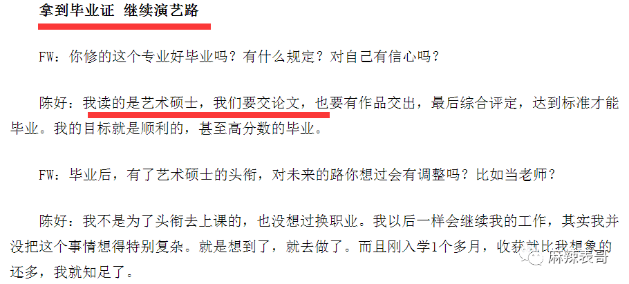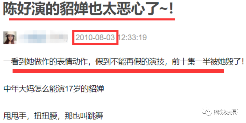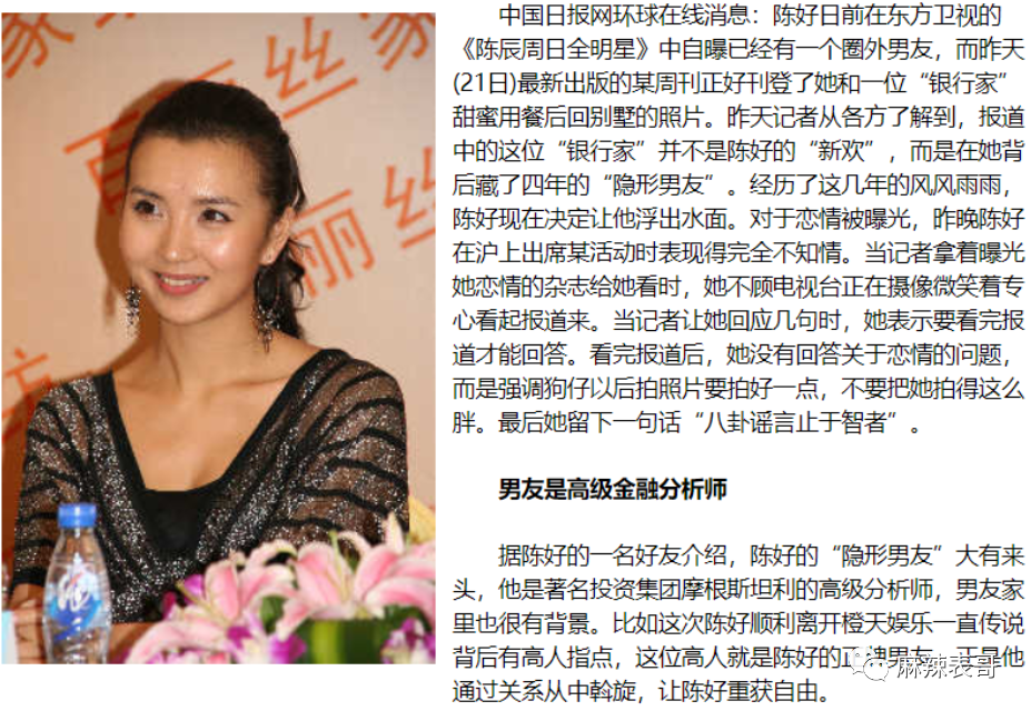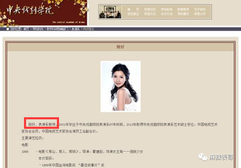 最近的瓜都比较奇怪,还在圈的悄无声息,不在圈的反而产瓜。比如昨天写的柯震东,前几天说的罗志祥,今天我们聊一聊陈好。对,就是那个演了万人迷但突然退圈的陈好。 近日,有网友发现在中戏的官网上,陈好在教授一职。 79年出生的陈好,今年42岁,按年纪粗粗来看的话,发奋钻研天赋异禀,评上教授没什么大问题。而且她早几年就以中戏老师的身份,出现在不少新闻中。比如前年中戏招生,陈好现身,一组照片就被夸过。 身材苗条挺拔,气质超群。 即便39岁,穿着简单的白衬衫,在一众学生当中依然惹眼。 再往前看,2015年就有媒体爆陈好现身食堂打饭,后来一查她是中戏表演系教师。 但这里有个问题,教师和教授的区别相当大。教师是个统称,只要在中戏教书,哪怕是挂名,都可以称为中戏教师。但教授就不一样,评级非常严格。2015年,媒体报道时,中戏官网上没有分级,统称为表演系教师。 找到的一些资料来看,当时张晓龙、刘天池也都属于教师列表里。 但到了2021年,中戏官网上分级,开始有了教授、副教授、讲师、助教等。陈好是教授 刘天池、蒋雯丽是副教授 周迅属于中戏讲师。 我们把时间再往前拉一点,2020年就有人发现了陈好是中戏教授。也就是说她的职称早早的在蒋雯丽、刘天池前面。 这就引起一些疑问了,刘天池在中戏教书多年竟然还拼不过半道退圈的陈好?不过也有网友说陈好安安静静教书,专业能力也没什么可怀疑的,是大家在找茬。 是不是找茬,我们理清楚时间线慢慢说,刚好把陈好这些年留的瓜都一并说全。陈好97年考入中戏表演系,当时同学有李宗翰和吴樾。 大二的时候,她就出演了第一部电影,刘烨主演的《那山、那人、那狗》。 想起中戏的接戏规定。大一大二学生不能接戏,如果想接戏,要得到班主任及表演课教师的批准,再经系里批准。 看来要求也并没有那么严格。大三的时候,也就是2000年,陈好和徐峥合作了《李卫当官》。 里面还有初出茅庐的赵丽颖。 资源其实都不错,毕业后,陈好拍的第一部电视剧是《乱世英雄吕不韦》。张铁林、宁静、陈好主演,张铁林还蛮辣眼睛的。  连拍了几部古装,都没有让陈好大红。但很快,机会来了,朱德庸漫画《涩女郎》改编成《粉红女郎》。 说起这部捧红陈好的剧,还蛮奇妙的,当初有一个选角瓜。导演本来是想让刘若英演万人迷。 当时刘若英也穿了低胸装努力朝万人迷靠拢。 但制片方一直没确定人选,于是片方把刘若英扮万人迷的视频发出来,号召大家一起加入进来。 那个时候陈好刚刚大学毕业,怕自己没办法演好,拒绝了四次,最后是硬着头皮接下了。但没想到,一举成功。年仅23岁的陈好,瘦而不柴,凹凸有致,身材没得说。 脸庞美艳、娇憨,媚而不俗,男女通吃。 一头大波浪卷,配一个简单的吊带。 万事准备充分,往镜头前一站,一颦一笑,像是勾引你但又不讨厌,说她是万人迷没人反对。 迄今为止,我都很难想象,有谁能驾驭住这种美而调皮,自带吸引所有人眼球的万人迷角色。倒是刘若英推荐了一下萧蔷,感觉可以试一试。 因为美貌、身材好、角色好、适配度高,那一年陈好拿下金鹰奖观众最喜爱女演员奖。之后,陈好的作品陆陆续续出来,大多是古装。和张卫健、关咏荷主演的《天下无双》。 《天龙八部》里饰演刘涛的妹妹阿紫。 以及和焦恩俊搭档的《我爱河东狮》。 包括2010年的《三国》里的貂蝉。 作为一个演员,陈好当年确实留下不少作品,但要说特别突出,也不至于,因为她拿奖不多。到了07年左右,陈好的作品就开始慢慢减少。一年只有一部剧在上,甚至2009年到2012年中间断了三年。 那三年陈好干什么去了呢?这就回到我们最初的话题,2010年她回学校读硕士了。 陈好准备的很充分,打算一年不接戏,专心出作品和论文,毕业后再继续拍戏。 对,2010年才读研,不过十年时间就成教授,惹人猜想吧?而且,在读研期间,陈好完成了自己的人生大事——结婚生子。2010年,陈好和刘海峰结婚,老公是投资界的大佬,哥伦比亚大学毕业,在国外工作了多年,比陈好大四岁。 之后她在2011年和2013年,生下两个女儿。 一边结婚生子,一边继续学业,在2013年陈好毕业,然后留校任教。当年黄磊也是如此,不过他是一口气读完7年,之后留校任教。硕士毕业后,陈好没有按照原计划大幅度的全面复出,反而是沉寂下来。2013年,她也不过34岁,对于女演员来说,至少还有5年时间,大青衣时间就更久。因此,外界传出很多陈好退圈的原因。第一个,说她2010年出演貂蝉被群嘲。 貂蝉只有十六七岁,陈好出演时已经31岁了,多少有点不太合适,而且她本身就长相偏成熟。 其实也还好,陈好31状态还是不错的,而且这剧最主要的问题是在编剧和剧情。 第二点,说是《新编辑部故事》扑了。2012年,陈好产后复出拍摄郑晓龙导演的《新编辑部故事》。 当年阵仗挺大,主演有黄海波、吕丽萍、井柏然等。 看似大阵仗而来,但最终结局不怎么样,因为表演浮夸,网友炮轰“今晚下班吧”。 读研前,演的貂蝉被嘲,复出后,演的《新编辑部故事》又收视低迷,因此有说她信心受挫,就退圈了。但其实,我个人觉得前两个原因都不太像是一个演员退圈的原因。论角色,多少演员都演过不适合自己的角色,陈好也并不是每一部剧都大红,而且《新编辑部故事》是按照导演的想法来演绎,就和张一山演《鹿鼎记》一样,并不完全是演员的真实水平。陈好自己也清楚