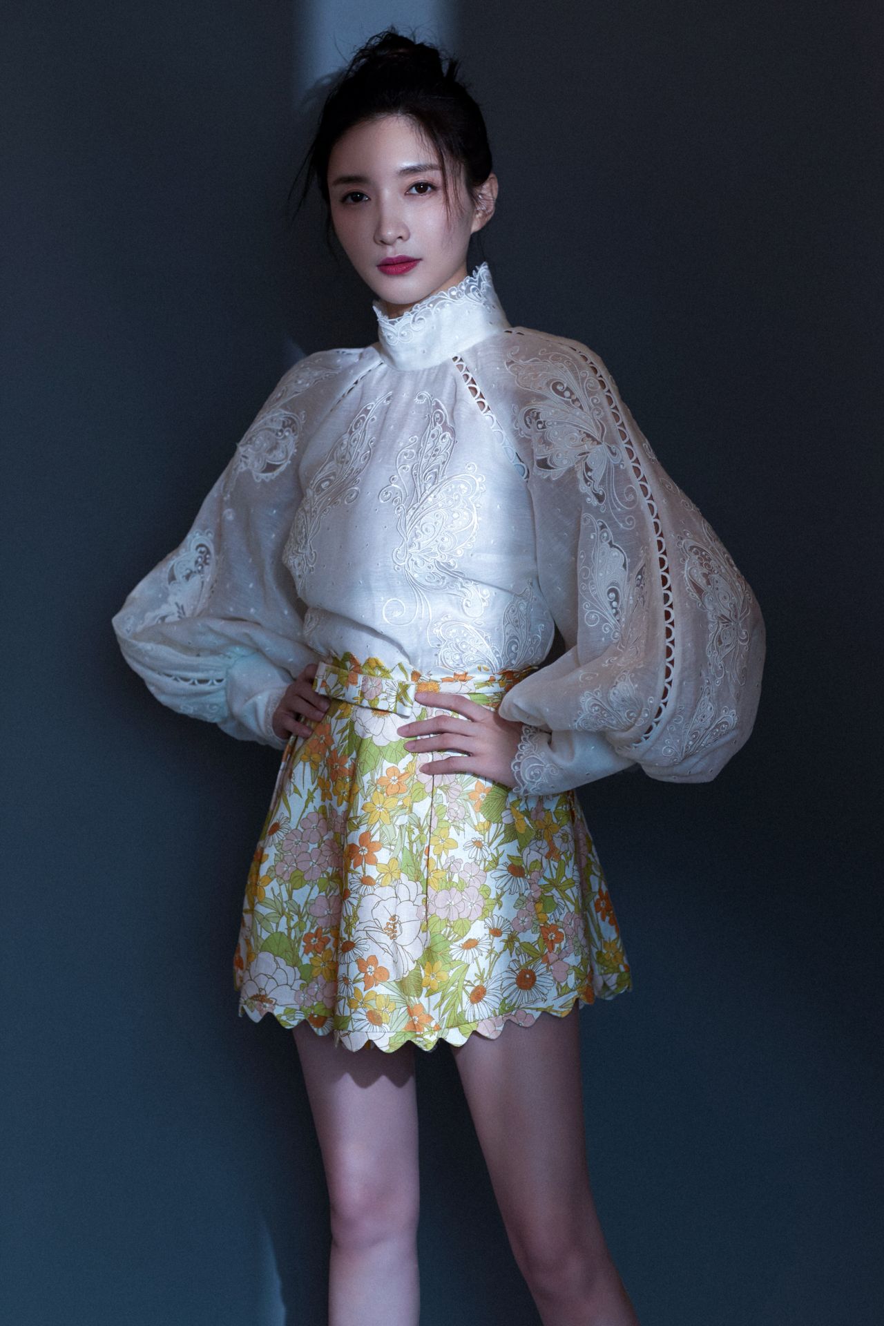 花色短裙搭配缕空上衣,尽显春天的气息