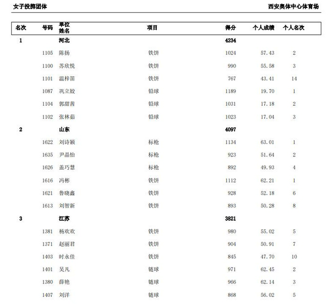 北京时间9月25日上午,在西安奥体中心进行的第十四届全运会田径比赛,结束了女子投掷团体赛争夺。最终河北队以4234分获得冠军,冠军队选手是陈扬、巩立姣、苏欣悦、郭甜茜、张林茹和温梓笛。山东队4097分亚军,江苏队3821分第三。