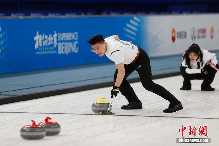 4月1日,北京国家游泳中心,冰壶比赛进行中。据悉,“相约北京”冰上测试活动将于4月1日至10日在北京举办。 中新社记者 韩海丹 摄