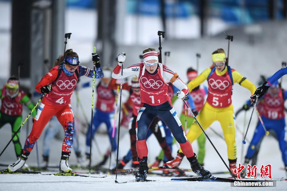 2月20日,2018平昌冬奥会冬季两项2x6公里女子 2x7.5km男子混合接力比赛落幕。法国队夺得金牌,挪威获银牌,意大利最后冲刺阶段以0.3秒优势力挫德国获得铜牌。图为选手们在比赛中。 中新社记者 崔楠 摄