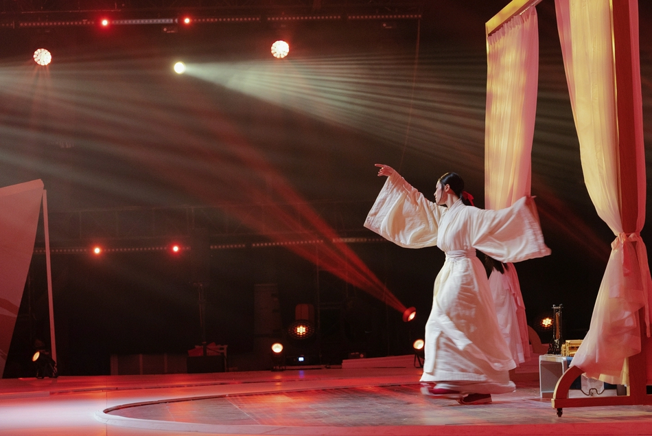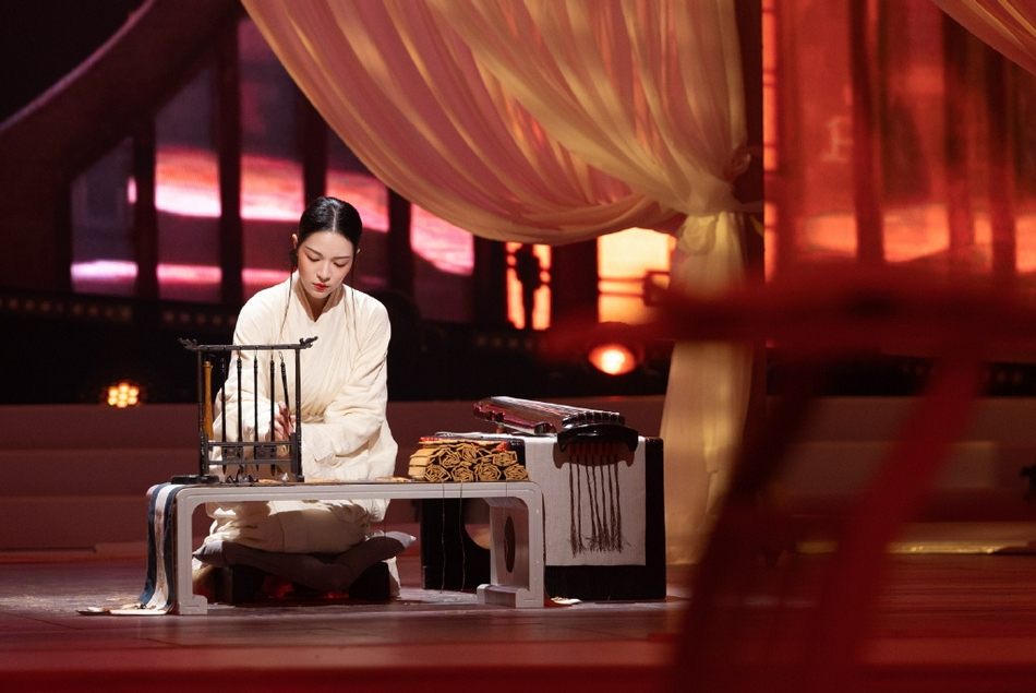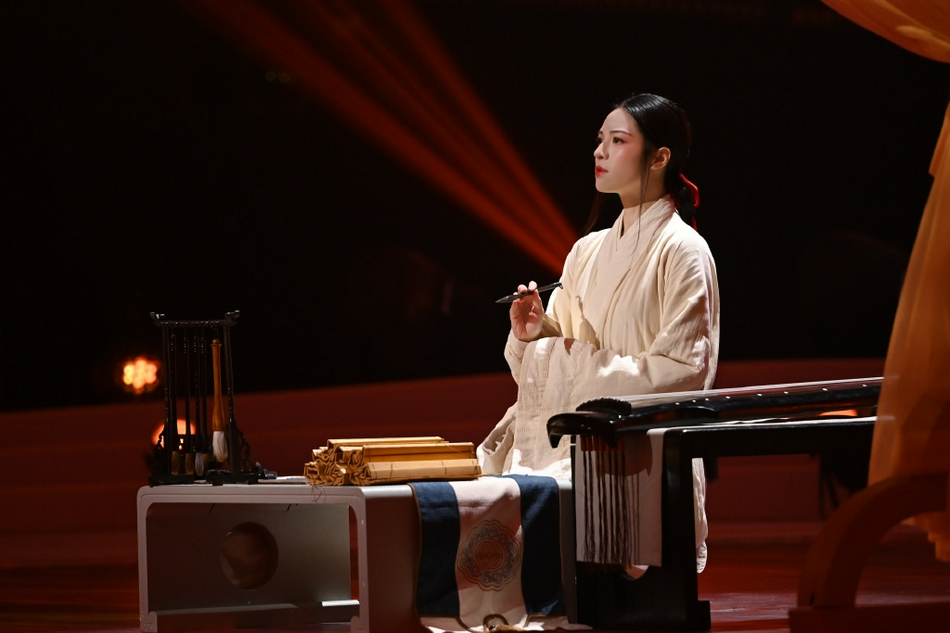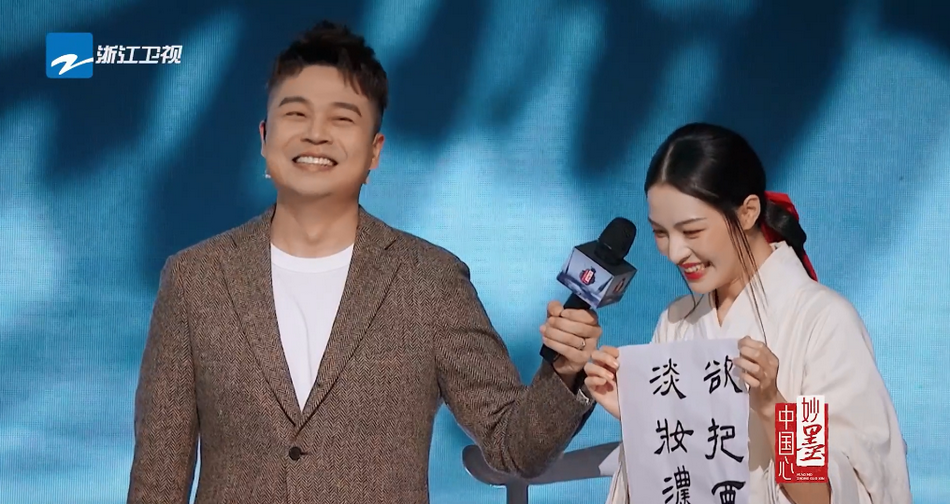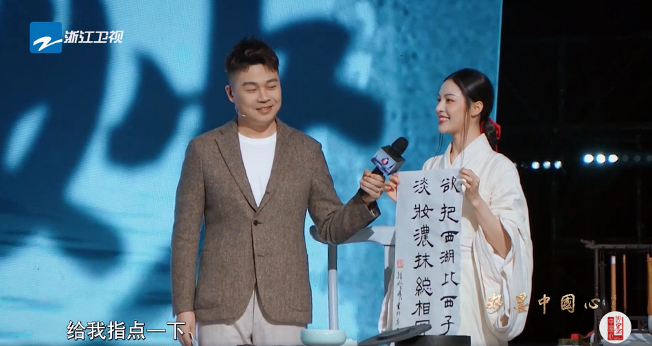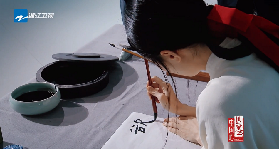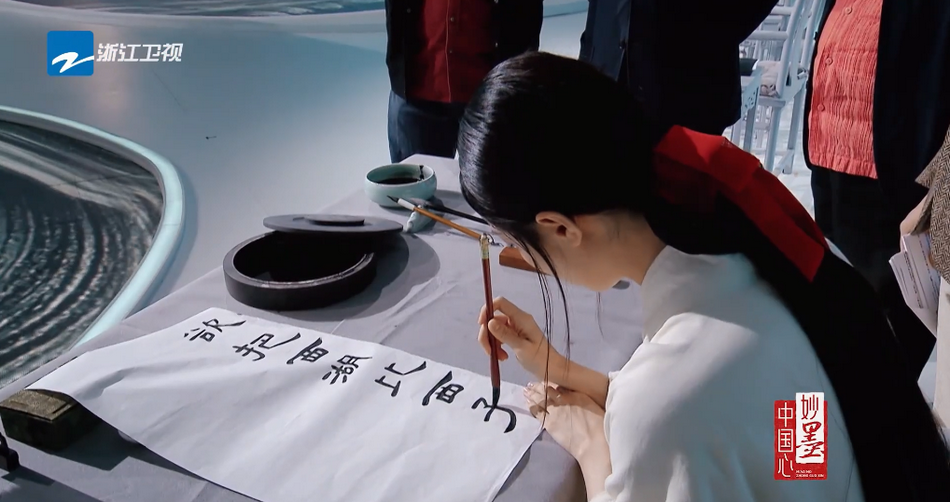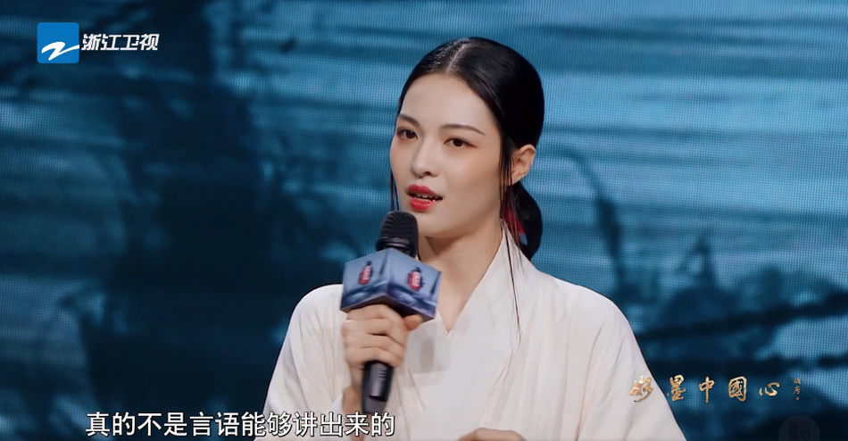 钟楚曦近日在节目中演绎中国第一位女书法家蔡文姬,现场穿汉服写毛笔字。