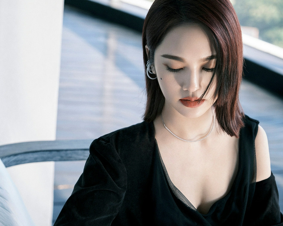 她身穿黑裙,肌肤白皙胜雪温柔秀逸