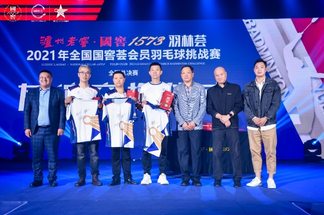 现场给为赛事发展做出突出贡献的丁睿、邓波、韩鹏三位羽林荟品牌大使赠与国窖1573·中国品味以及签名版球衣
