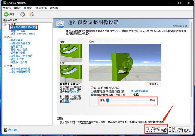 2、点击【通过预览调整图像设置】-【使用我的优先选择】,接着移动滑块至【性能】,点击【应用】。
