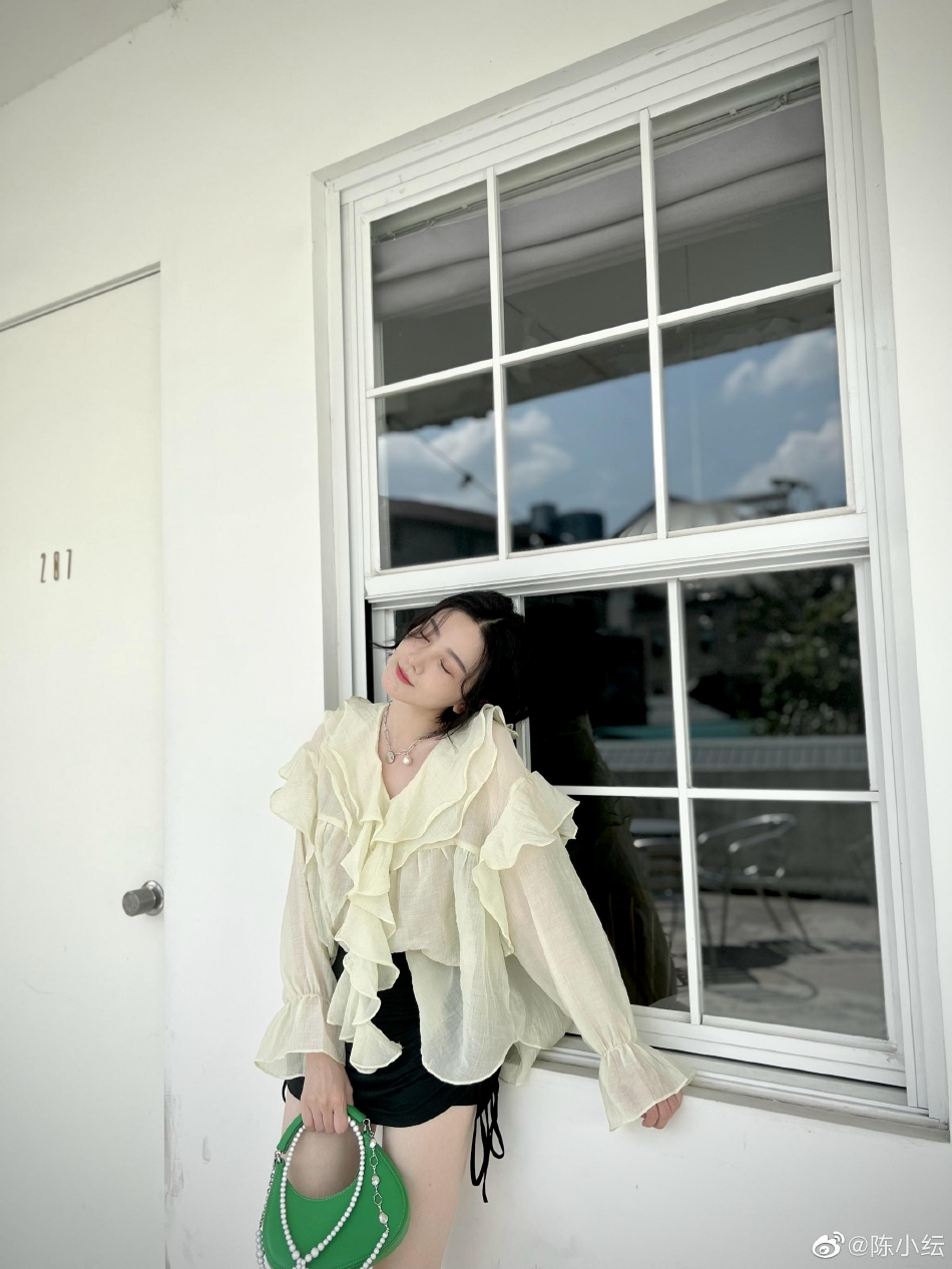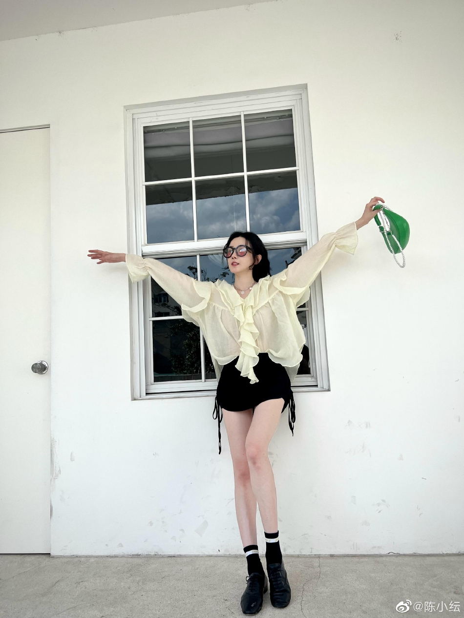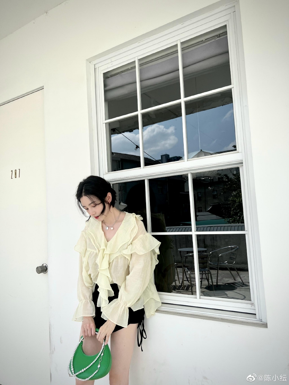 4月24日,陈小纭在微博晒出一组初夏清新感写真。照片中,她身穿米黄色上衣,下搭黑色短裤,可爱满分。
